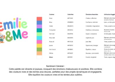 Dans le cadre de ce projet, je suis principalement responsable de la fourniture d’illustrations et de l’ensemble du visuel destiné aux supports pédagogiques conçus pour les enfants de 3 à 7 ans, couvrant ainsi deux niveaux d’apprentissage distincts. En plus de ces responsabilités créatives, il m’a été confié la tâche de concevoir le site internet du projet, qui est actuellement en cours de préparation. Mon rôle implique donc une collaboration étroite avec l’équipe pour garantir que les supports visuels et numériques répondent aux standards de qualité élevés que s’est fixés Emilie & Me.